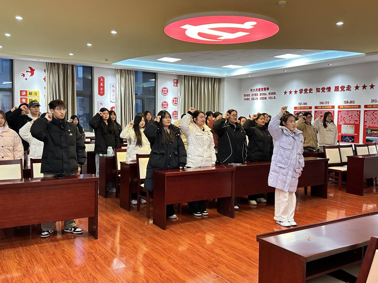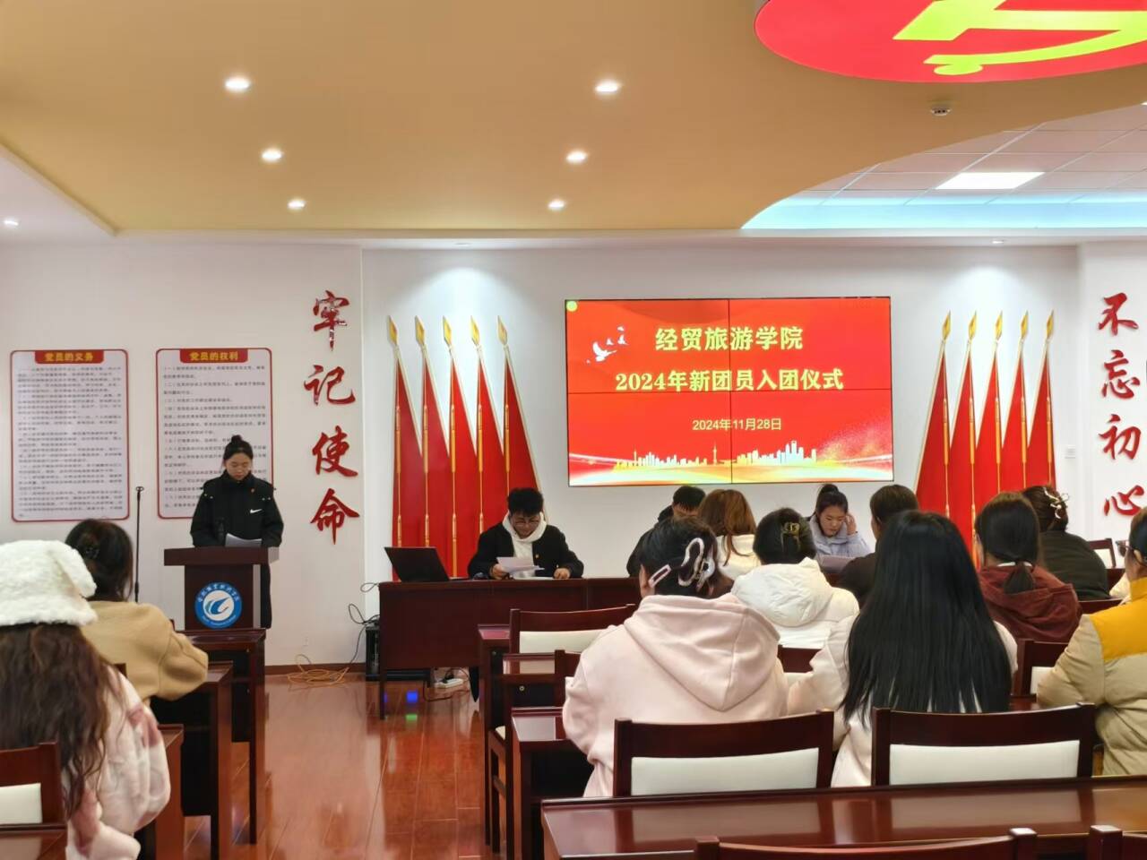 为坚定青年学生理想信念,引领团员青年永远跟党走,万象城娱乐awc线路团总支于2024年11月29日下午在经贸楼党性体验馆为新团员举行了入团仪式,此次仪式由杨昇同学主持。