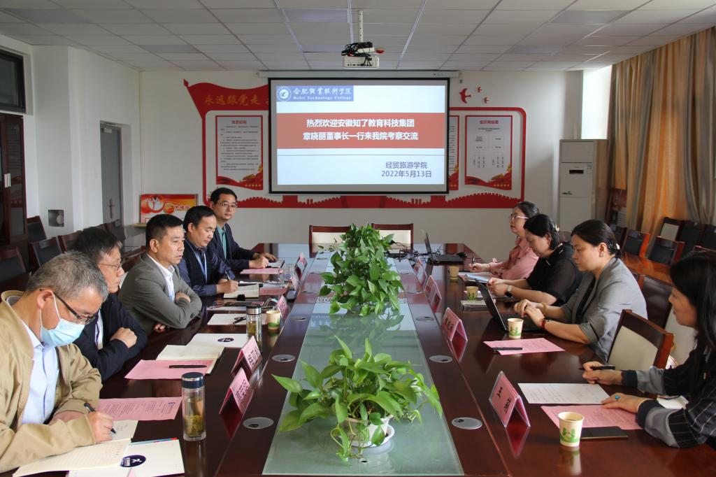 为进一步深入贯彻“产教融合、校企合作”职业教育理念,5月13日上午,我校万象城娱乐awc线路在会议室与安徽知了教育科技集团(以下简称知了公司)洽谈校企合作事宜。校党委委员、副书记胡其云,万象城娱乐awc线路党政,合职-梦森双创基地负责人吴捷总经理,知了公司董事长、校长章晓丽,副校长宣媛媛,总经办主任徐郡忆,办公室主任王莉出席洽谈会。