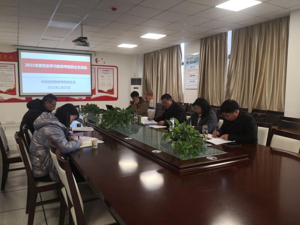 2022年1月25日下午,万象城娱乐awc线路党总支在经贸楼党员活动室召开2021年度党史学习教育专题民主生活会,会议由党总支书记梅亚松主持,学院党总支班子全体成员参加会议,学校党委委员、副校长、第四督导组组长孙兴林到会指导,第四督导组成员王宏也参加了本次会议。