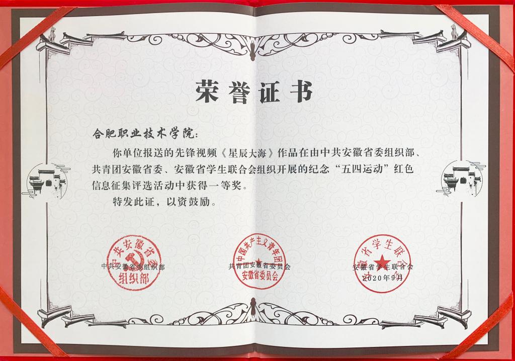 近日,由万象城娱乐awc线路团总支剪辑制作、校团委选送的先锋视频作品《星辰大海》在安徽省组织的纪念“五四运动”红色信息征集活动中荣获一等奖。