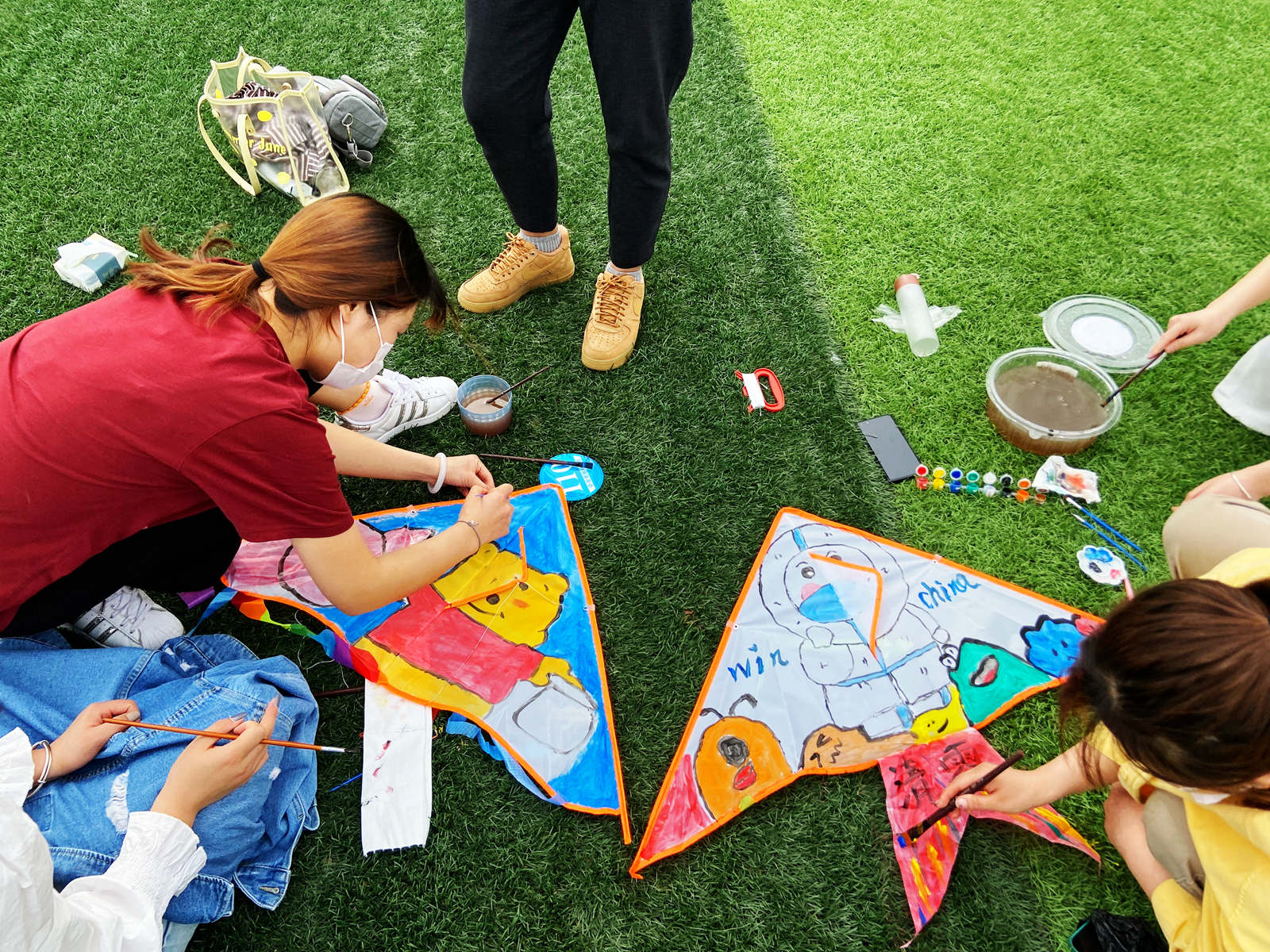 活动主要分为风筝制作、作品展示和放飞风筝三个环节。参加活动的同学以小组为单位,每组2-4人,各小组成员积极发挥想象力和创造力,共同进行风筝DIY创作。大家各展才能,纷纷在风筝上绘上各种各样的图画和活泼可爱的卡通形象,有奋战一线的抗疫大白,有默默无闻的红马褂志愿者,还有指导抗疫的钟南山院士、张文宏专家……大家把对感谢的人、感恩的心和对抗疫胜利的信念化作水墨色彩,尽情挥洒。