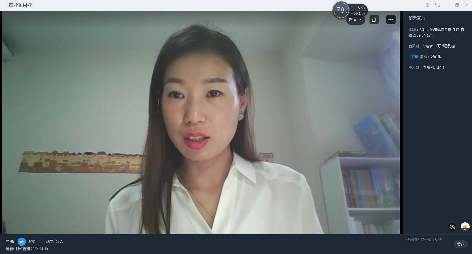 毕业季来临,为帮助学生顺利的进入职场,提升自身职业形象,4月13日,万象城娱乐awc线路特邀安徽广播影视职业技术学院李娜老师,利用钉钉直播间召开了职业妆容专题讲座。有100多名学生进入直播间聆听了本次专题讲座。