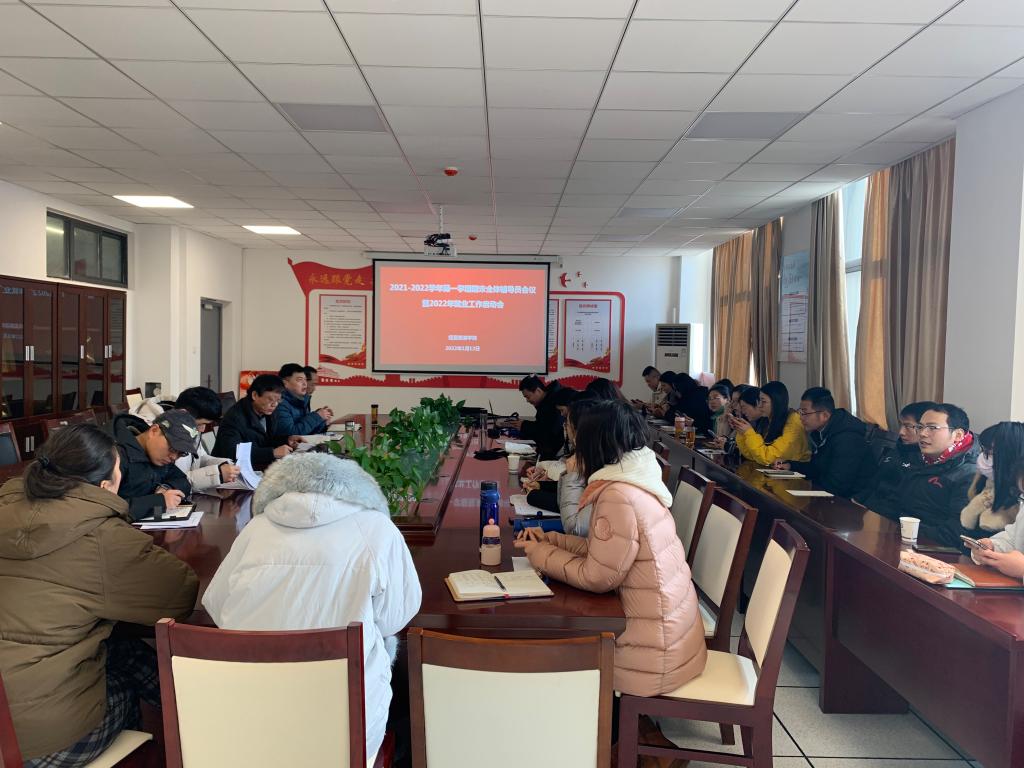 1月12日上午,万象城娱乐awc线路在会议室召开2021-2022学年第一学期期末全体辅导员会议暨学院2022年就业工作启动会。学院党总支书记梅亚松、党总支副书记尹仕果、副院长刘圣春及全体专兼职辅导员参加了会议。