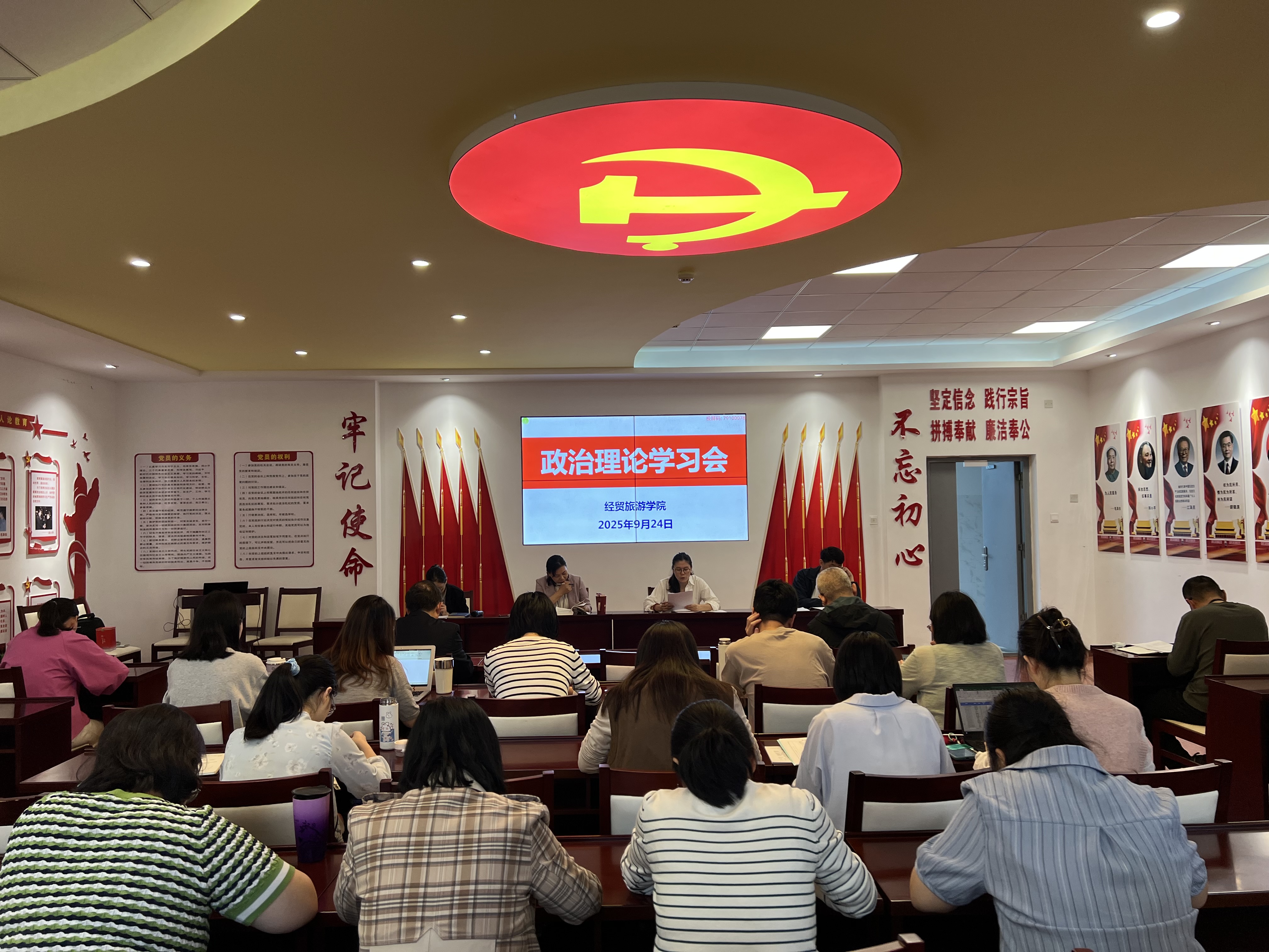 院长赵红领学《习近平谈治国理政》第五卷节选内容;党总支委员王明明领学习近平总书记在纪念中国人民抗日战争暨世界反法西斯战争胜利80周年大会上的重要讲话以及《求是》发表习近平总书记的《弘扬伟大抗战精神,向着中华民族伟大复兴的光辉彼岸奋勇前进》重要文章;第四党支部书记任向英领学习近平总书记的《走好中国特色金融发展之路,建设金融强国》讲话精神,并结合金融教研室工作及专业实际展开交流研讨。付晓兰通报了近期发生的5起教育领域违纪违法典型案例,要求全体教职工以案为鉴,严守纪律红线。