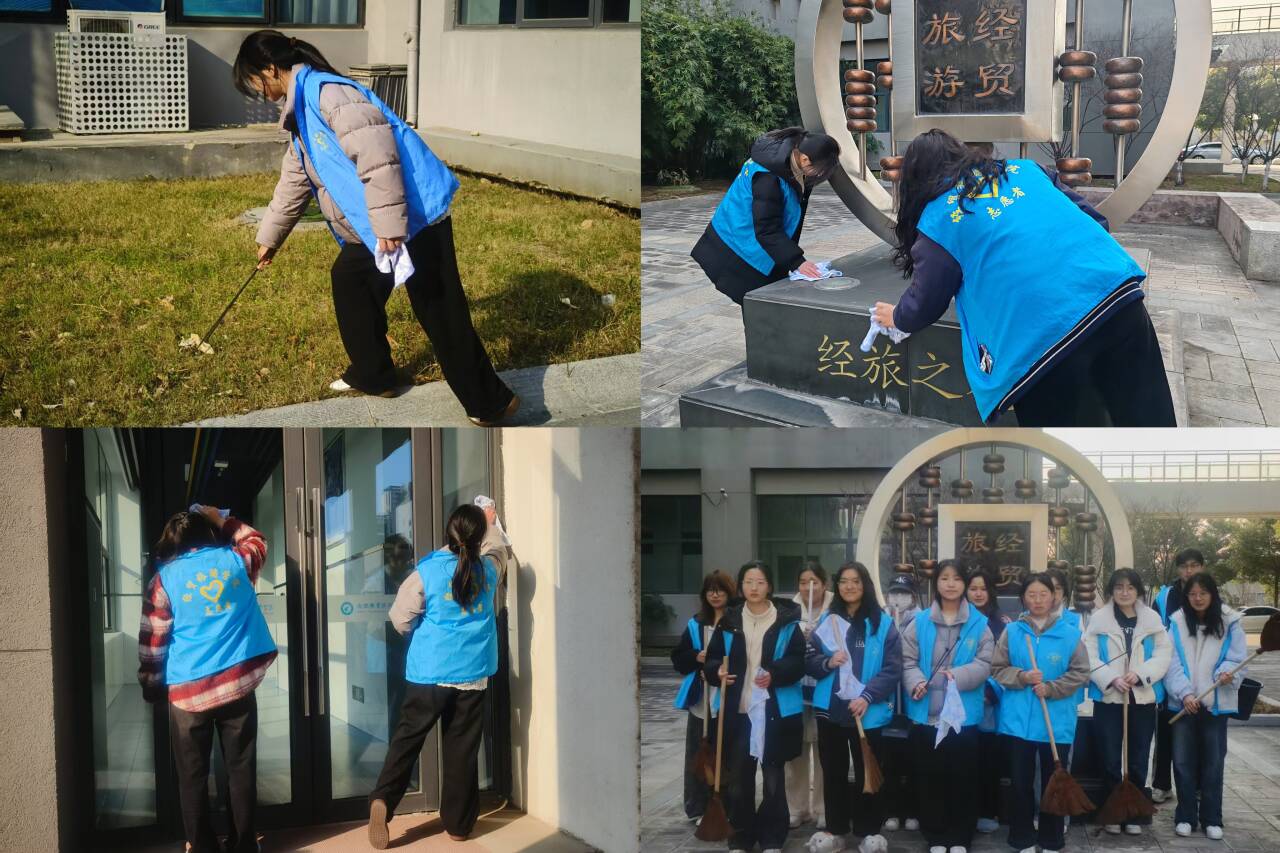 活动期间,志愿者们早早集合在经贸楼前广场,在简单的任务分配和工具领取后,迅速奔赴各自的清扫区域。经贸楼的每一个角落都活跃着他们忙碌的身影,有的志愿者手持扫帚,认真清扫着地面垃圾;有的则拿着抹布,仔细擦拭着教学楼的门窗、栏杆;还有的志愿者推着垃圾桶,来回穿梭,及时清运垃圾,保障清扫工作的高效进行。在清扫过程中,志愿者们充分展现出了团结协作的精神。面对一些繁重的清扫任务,大家齐心协力,共同克服困难。