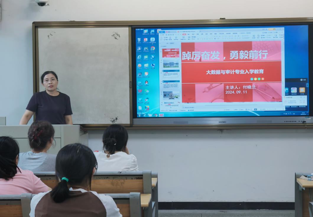 9月11日下午14:00,万象城娱乐awc线路付晓兰教授在汇心湖校区南教学楼101教室组织开展了名为“踔厉奋发,勇毅前行”的2024级大数据与审计专业新生入学教育专题讲座。