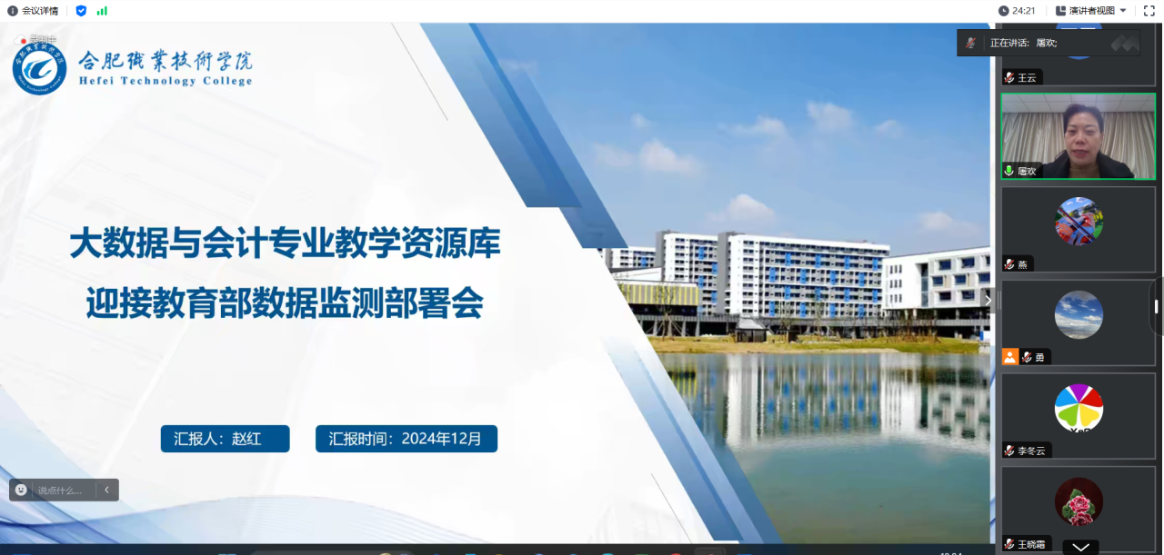 会上,赵红首先对出席会议的各参建单位代表表示热烈的欢迎和诚挚感谢,并向与会代表介绍了我校发展历程和专业教学资源库的建设规划、建设成果以及当前存在的问题和解决对策。她表示,作为教学资源库建设第一主持院校,我们会充分履行职责,全面统筹推进建设工作,希望与全体参建院校一起携手,高质量完成资源库建设任务。联合主持院校江苏财会职业学院会计学院副院长沈欣和广东财贸职业学院数字财会学院院长钟秉盛作发言,他们从课程建设、素材制作、产教融合等方面介绍了在资源库建设过程中取得的成果,他们表示资源库建设是推动教育数字化转型的具体抓手,建设资源库的过程也是促进课程建设、深化专业改革的过程,呼吁各兄弟院校一起行动起来,把工作落到实处,积极完成资源库建设的各项任务。