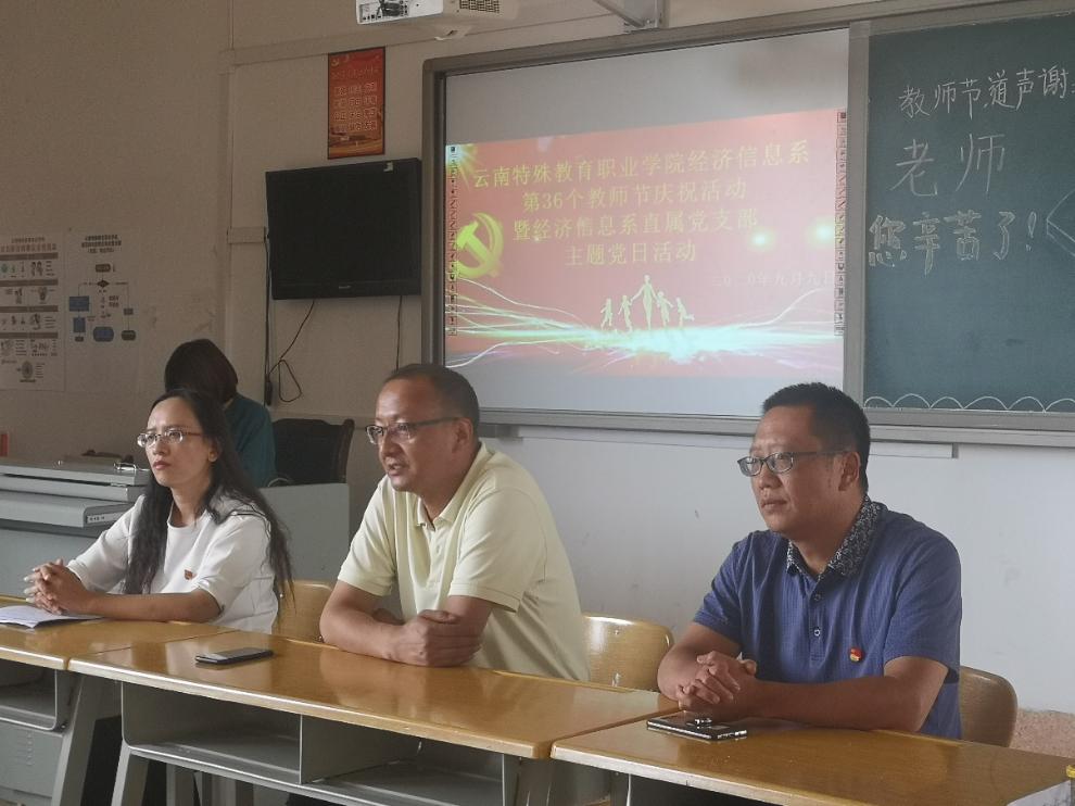 活动共分为六个议程。第一个议程经济信息系全体教师在支部书记王小川同志的带领下,重温师德规范,郑重宣誓。第二项议程经济信息系主任高翠同志向经济信息系全体教师致以节日的问候和祝福。第三项议程分别让党员教师代表黄继云同志和非党员教师代表黑丹同志讲话。第四项议程经济信息系五名大、中专学生代表全系同学向老师们表达了真挚的节日问候,并朗诵了诗歌《老师,辛苦了》。第五项议程支部书记王小川同志对经济信息系全体教师表达了节日的问候,并提出了要求,要求全系教师要做好“四有”好老师,要有理想信念,要有道德情操,要有扎实学识,要有仁爱之心。第六项议程学院党委书记孙继先同志发表了热情洋溢的致辞。他肯定了老师们在工作岗位上的辛勤耕耘和默默付出,并为有这样一个奋进向上、团结和谐的集体而高兴。他感谢经济信息系全体教师为学校发展做出的重大贡献,并向在座的教师致以节日的问候和祝福。
