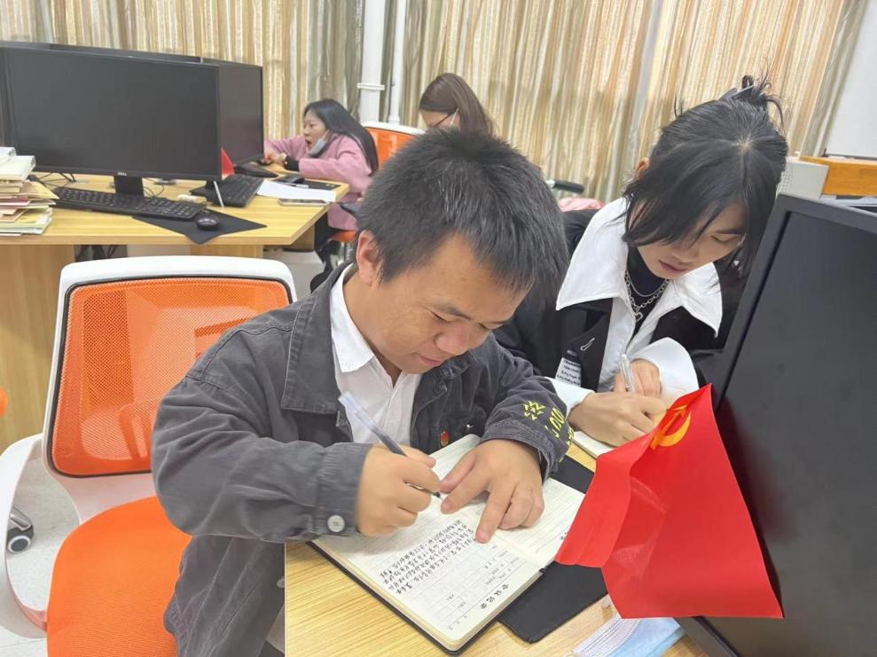 图为两名积极分子记录大会内容的图