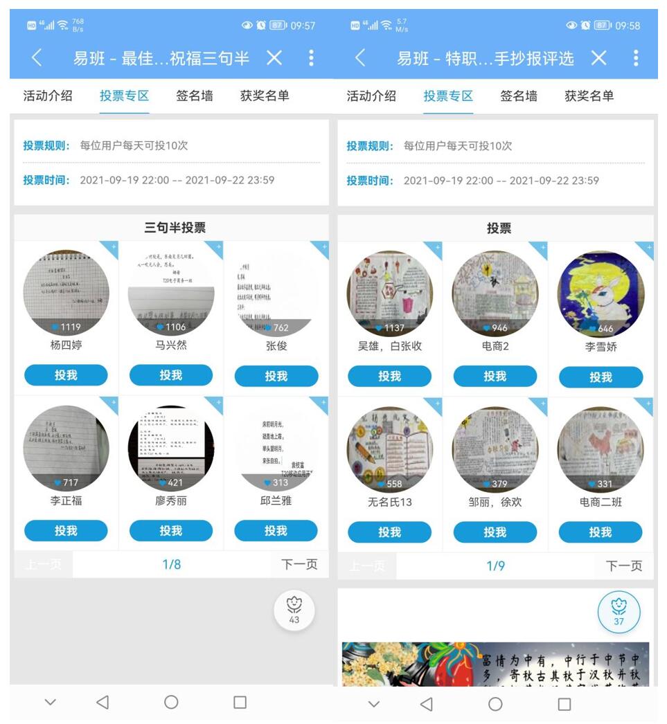 同学们用手中的画笔描绘一幅幅生动鲜明的图片,精选一段段经典的文字诠释了中秋的起源、传说、习俗、寓意。用诗词、歌谣表达了对幸福生活的珍惜,对美好未来的憧憬,对传统节日的热爱。此次活动同学们积极参加,共有51名同学制作手抄报,48位同学参加“三句半”活动。经过同学们在易班线上三天仔细评比的投票,两个活动各评选了最优秀的前三名作品。
