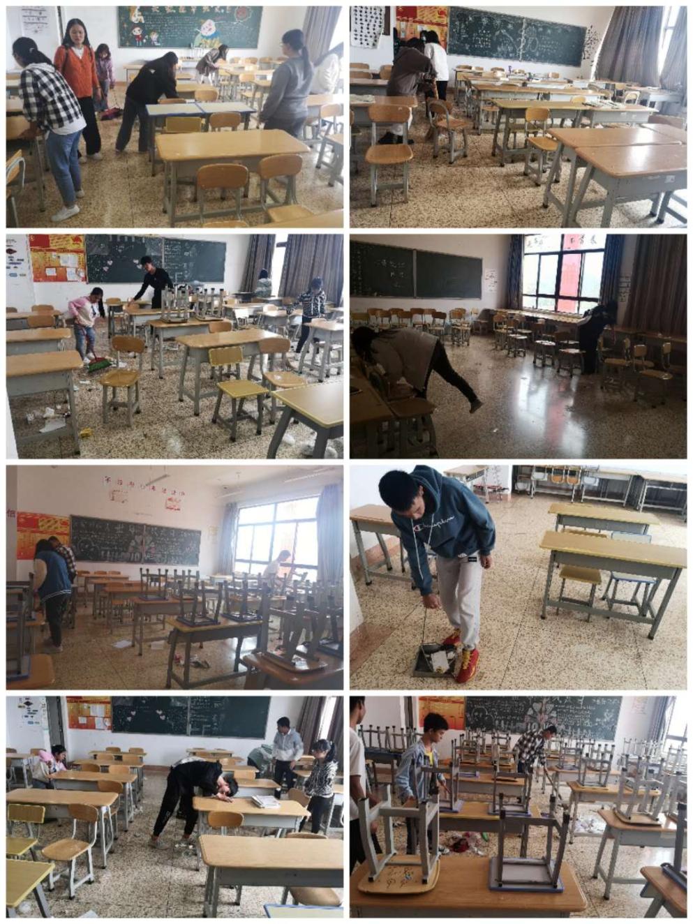 图二 学生正在辛勤打扫教室卫生、整理桌椅