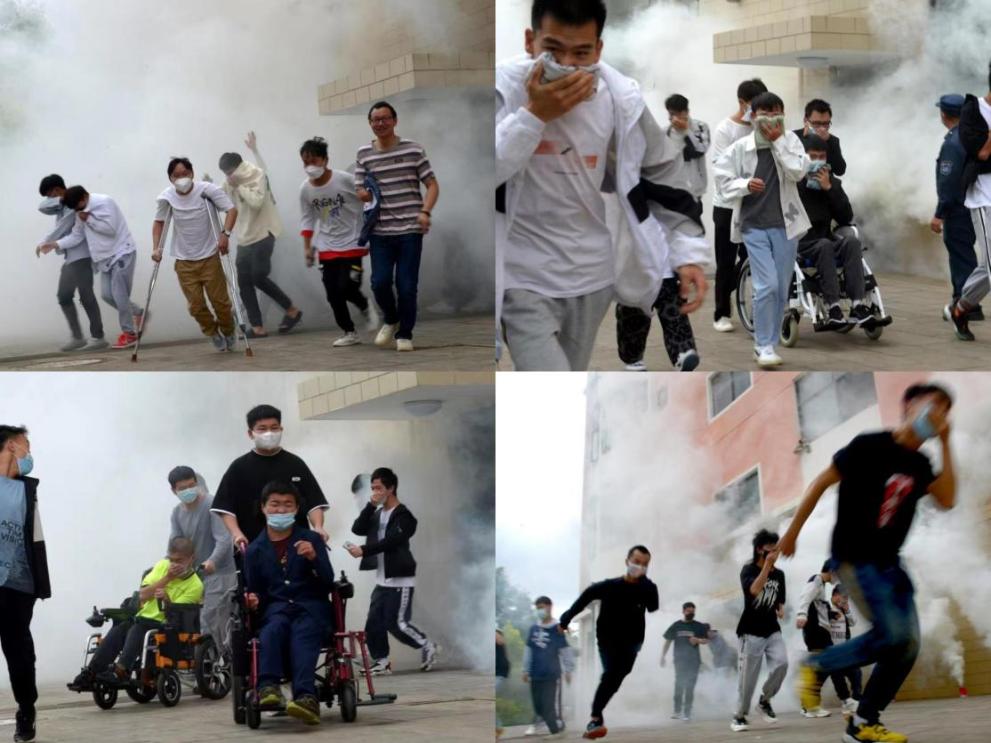 13点20分,参演师生均已就位,参演保安布置好各处烟雾弹。13点30分,参演保安点燃烟雾弹,学院广播响起火灾警报。参演师生立刻按照提前安排好的顺序和逃生路线有序快速的进行撤离。