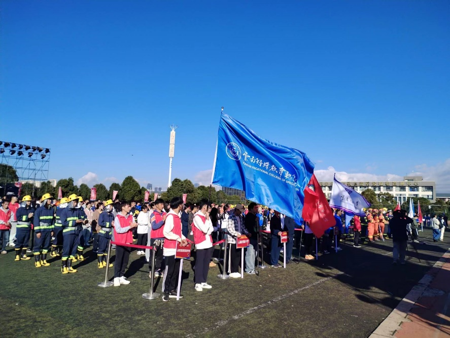 11月9日,保卫处带领学校学生参加由呈贡区消防救援大队主办的首届“春城火焰蓝杯”高校消防运动会,运动会上,学生们出色地完成了“400米障碍接力赛”“初战快速出水控火操”“大家来找茬”消防隐患精准识别三个项目比赛。通过项目比拼,让学生们在运动中“零距离”学习消防知识。活动在“解锁”消防课堂新体验的同时,进一步增强了大家的消防安全意识。