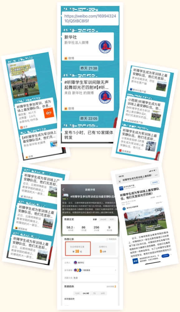 新闻发出后,今日头条、腾讯、新浪、搜狐、网易、快手等十余家媒体纷纷转发。当晚新华社热搜榜一度冲至第38位。截止到21号上午,新华社客户端浏览量突破百万,快手播放量也有82万、获点赞4.7万。KY开元军训场上“最安静”的训练队伍,备受关注!