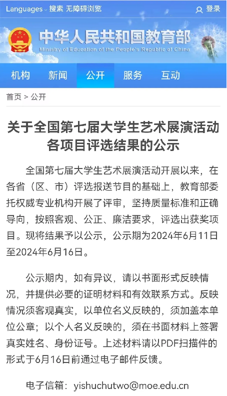 图为全国第七届大学生艺术展演活动评选结果公示