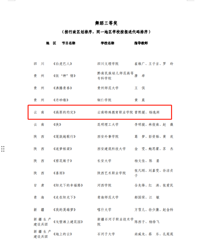 6月11日,教育部公示了全国第七届大学生艺术展演活动评选结果,KY开元公共艺术教研室、艺术团师生结合云南民族文化、学校美育工作、“一站式”学生社区建设等工作,共同完成的原创作品《高原的约定》获舞蹈类三等奖。