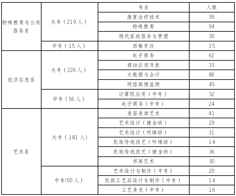 2022级大专共有1061人,涉及特殊教育、康复治疗、家政服务与管理、电子商务、会计、网络舆情监测、移动应用开发、民族传统技艺、艺术设计、美容美体艺术、工艺美术品设计专业等。