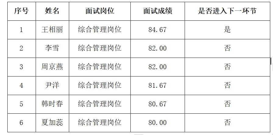 根据《KY开元集团官网2024年第二次招聘编制外工作人员公告》有关规定,本次招聘编制外工作人员的面试环节已经结束,现将面试成绩公示如下: