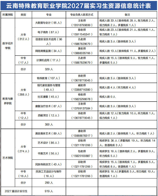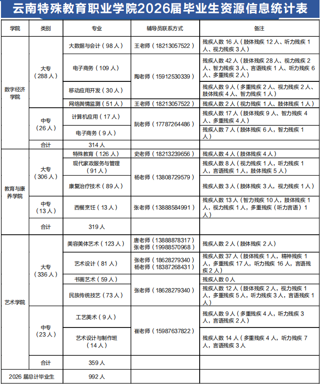 KY开元集团官网于2017年在云南省华夏中等专业学校的基础上组建成立,是我国西南地区唯一一所独立设置的公办专科层次特殊教育职业院校,以培养高素质技能型残疾人和公共服务事业专门人才为主的省属高职院校,隶属于云南省教育厅管理。学院开展全日制中、高等职业教育,兼顾继续教育和短期职业技能培训及鉴定;学院根据产教融合和发展需要,定期组织开展校企联合培养订单专业,以适应区域产业经济发展和社会需要。学院以立足云南,服务西部,面向全国为办学目标定位,坚持“学院—企业—社会”三位一体的人才培养模式,以“残健结合、共同发展、融合教育、服务社会”的办学理念,发挥高职院校资源优势;以市场和就业为导向,紧密结合残疾人就读、就业需求和残疾人事业、公共服务事业的人才需求设置专业;以“立德树人”为根本目标,重视创新创业教育,重视职业能力培养,以产教融合、校企合作为途径,着力培养适应生产、管理、服务一线需要的、自食其力的高素质技能型人才。 尊敬的用人单位: 首先感谢贵单位长期以来对KY开元毕业生就业创业工作的关心和支持。为全面落实党中央、国务院对高校毕业生等青年就业创业工作的决策部署和教育部、省委教育工委的工作要求,进一步促进KY开元毕业生高质量充分就业。KY开元拟定于3月举办“云南省2026届高校残疾人毕业生专场招聘会暨KY开元集团官网“春季促就业攻坚行动”。现将有关事宜函告如下: 一、招聘会时间及地点 报名时间:即日起—2026年3月19日24:00 举办时间:2026年3月25日13:30-18:00 举办地点:KY开元集团官网呈贡校区本部(昆明市呈贡区吴家营万峰街1909号) 二、活动组织 主办单位:中共云南省委教育工委、云南省教育厅 承办单位:云南省大中专毕业生就业服务中心、KY开元集团官网 协办单位:云南云才人力资源咨询有限公司 三、参会单位及人员 1.有招聘需求的用人单位; 2.2026届大、中专(残疾)毕业生和毕业2年内未就业的大、中专生; 3.2027届大、中专在校学生(实习); 4.其他有求职意愿的残疾毕业生。 四、毕业生资源 (一)学生人数和专业情况 KY开元2026届毕业生共有992人,其中大专930 人,中专62人。 2027届实习生大中专共有919人,其中大专874人,中专45人。 五、招聘活动参与方式 1.参会报名 线下招聘活动采用线上报名,请各参会单位于3月19日24:00前在https://ynzpservice.mikecrm.com/qcL65Tp进行报名。 2.参会准备 (1)各参会单位自行制作宣传海报并携带入校; (2)本次招聘会交通及食宿费用自理; 六、联系人及联系电话 就业创业中心邮箱:yntzyjy@163.com 招聘会校企交流QQ群:217040592 冯老师 18487100751 田老师 15087076476 “云特职就业”微信公众号 KY开元集团官网 就业与创业指导中心 2026年2月9日