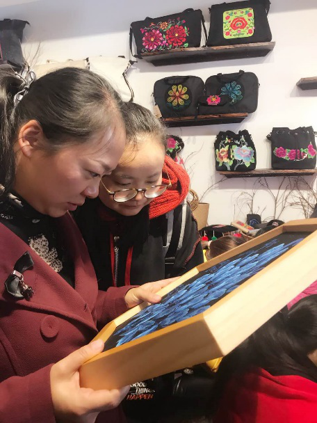 图为KY开元民族技艺传承专业教师在观摩当地残疾人彝绣作品