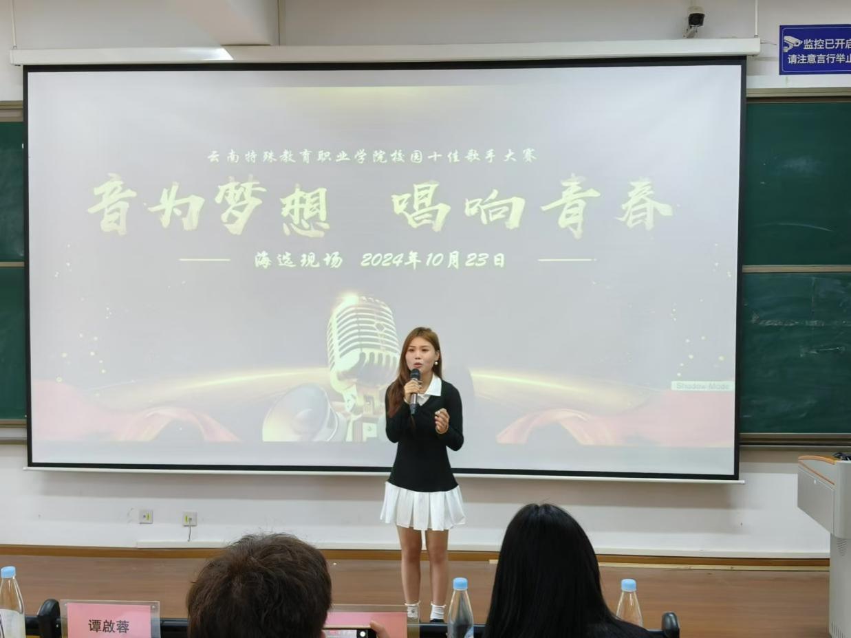学校党委副书记石安银、学生处处长兼团委书记朱云佳、人事处处长周雪、学生处副处长罗宝艳、团委副书记饶晓雯、特殊教育与公共服务系团总支书记史洋以及艺术团指导老师杨逸洲担任评委。他们聆听着选手的精彩演唱,用他们专业的评判标准为大赛选出最闪耀的音乐之星。