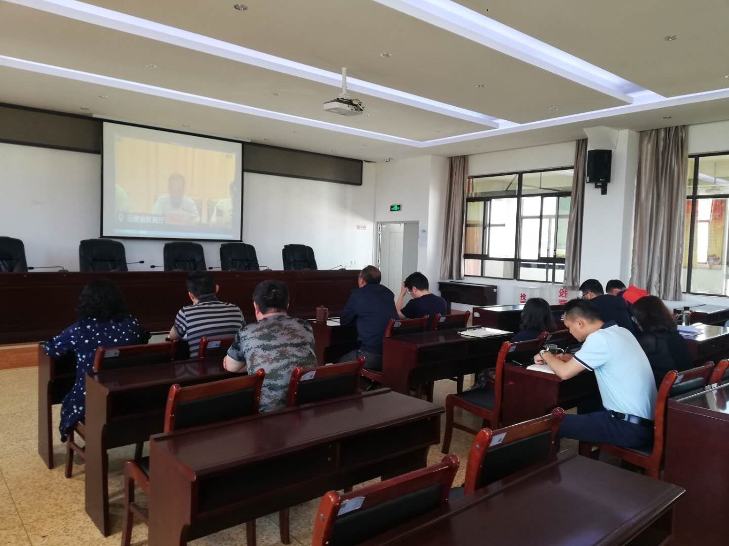 图为 学院党委书记及其他两委成员观看视频会议