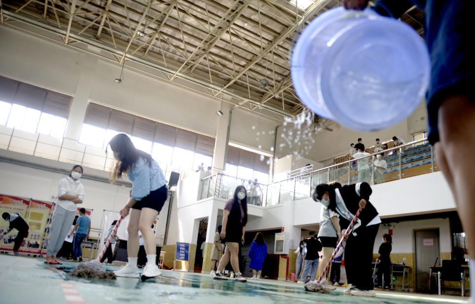 图为同学们对礼堂进行大扫除