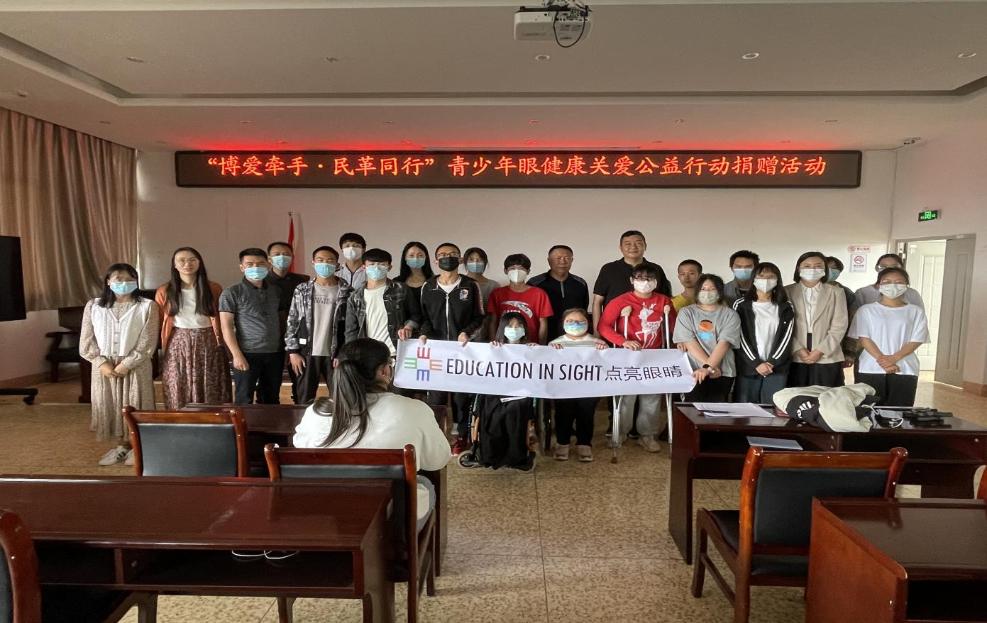 图为残疾学生与民革市委、昆明润城普瑞眼科医院及昆明市官渡区点亮眼睛公益中心爱心人士合影