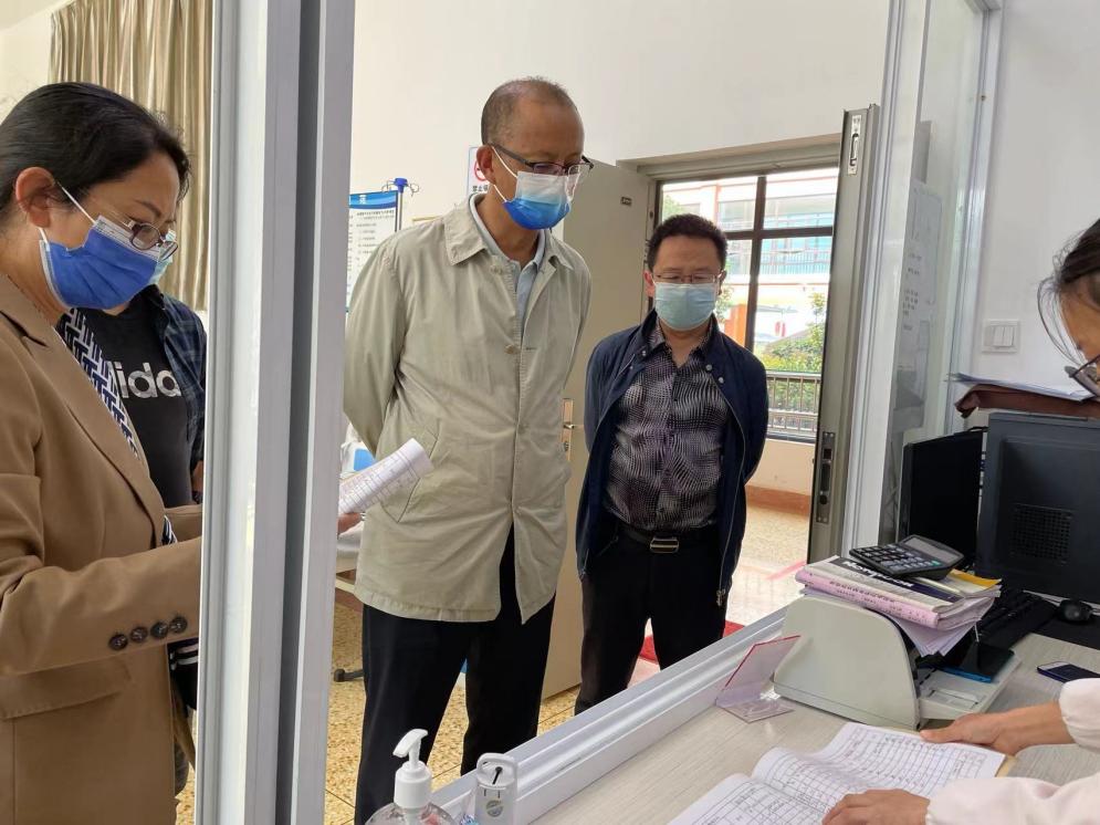 图为检查组在校医室查阅分诊情况