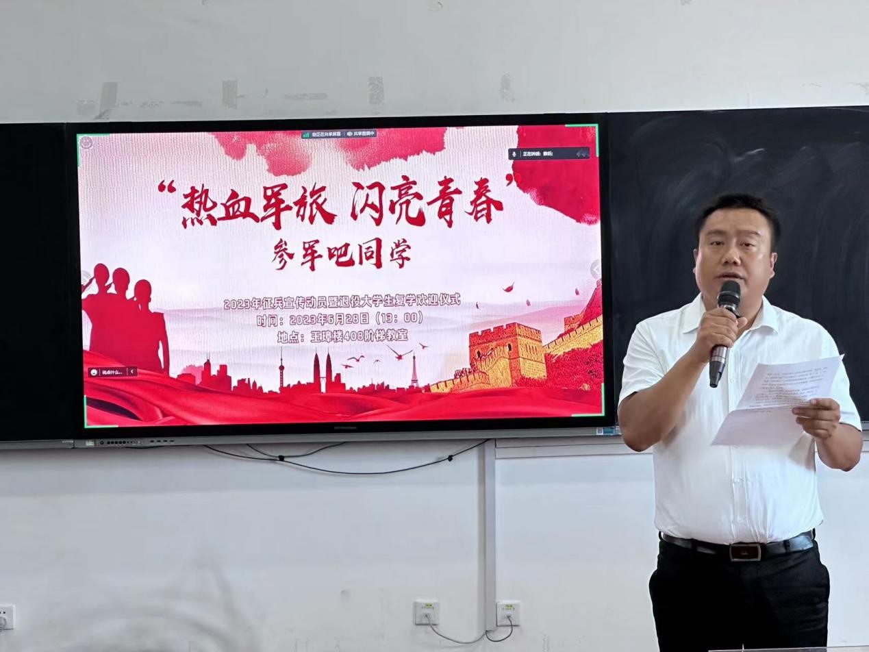 学校党委副书记石安银代表学校党委向长期支持学校工作的呈贡区退役军人事务局表示衷心感谢,向载誉归来的退役学生表示热烈欢迎,并希望退役复学学生把在部队学到的优良传统继续保持发扬。同时,为进一步推动学校征兵工作,石安银副书记提出了三点要求:一是提高政治站位,明确任务,落实责任;二是广泛宣传动员,讲清讲透政策,加强征兵宣传力度,用身边典型案例教育感染引导学生;三是提高服务意识,吃透吃准政策,将服务送到学生中间,让学生少跑路。