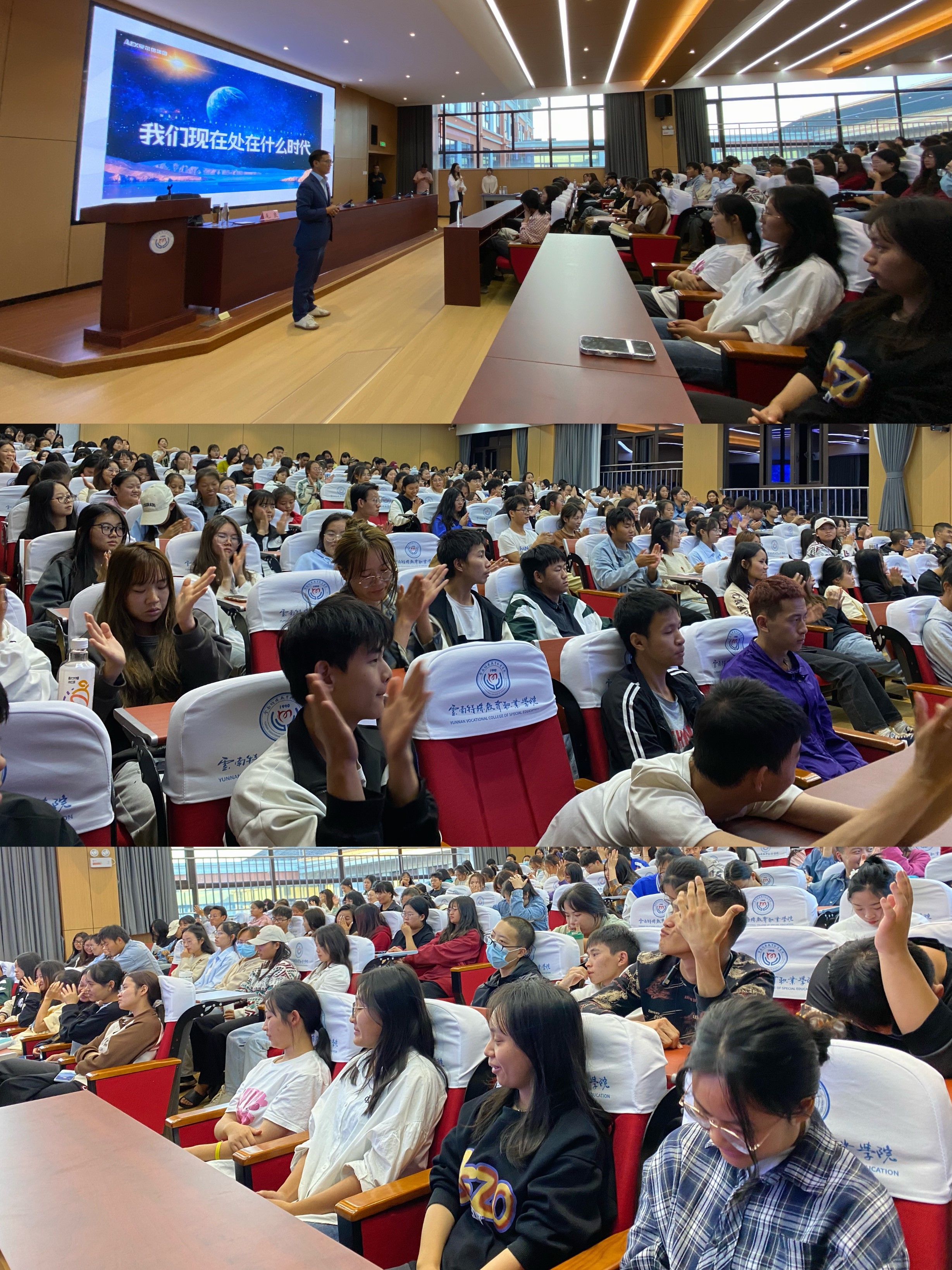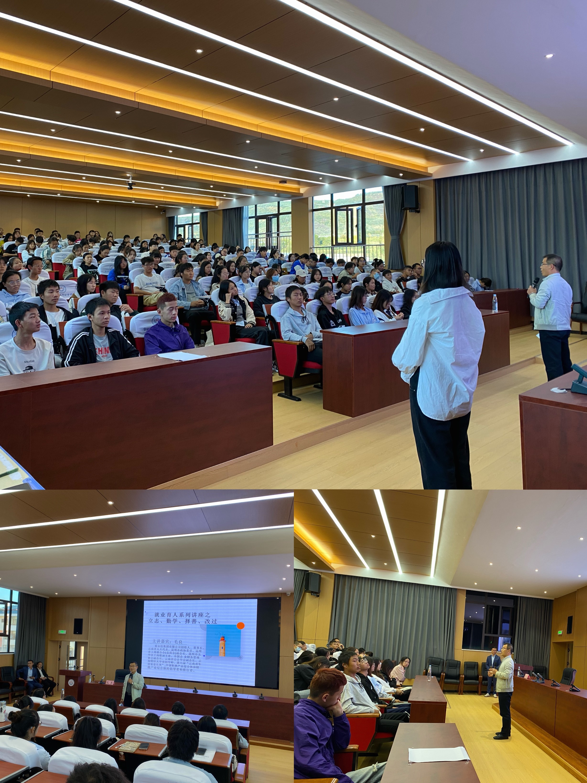 10月19日晚,由学生就业创业中心主办的就业育人讲座在学校多功能报告厅举办。本次很荣幸的邀请到优秀企业家、云南省人大代表、昆明市政协委员毛良老师。他给同学们分享了一场关于立志、勤学、择善、改过的励志故事讲座,本次讲座由李永芳副校长主持,特殊教育与公共服务系、经济信息系、艺术系三个教学系积极组织200余名同学参加。