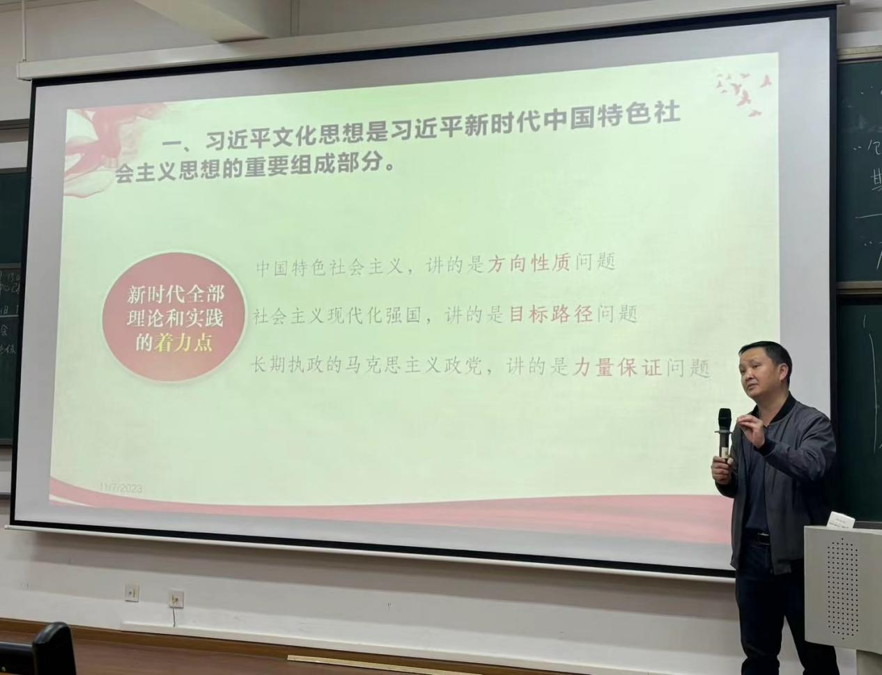 李老师紧紧围绕“习近平文化思想是习近平新时代中国特色社会主义思想的重要组成部分;习近平文化思想的丰富内涵;习近平文化思想是继续推动文化繁荣、建设文化强国、建设中华民族现代文明的行动指南”三个方面,以生动的语言和准确的描述为特职院的学生带来了一场生动的讲座。