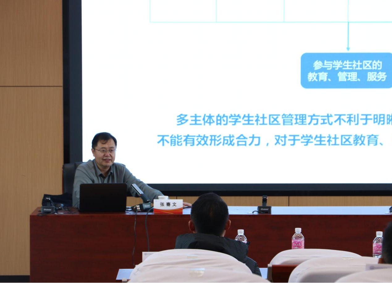 第一场李广涛副教授以“‘一站式’学生社区建设的思考与实践——以云南国土资源职业学院为例”为题进行讲解。讲座开始,李教授首先对党建引领的前沿阵地、队伍入驻、社区物理空间建设等“一站式”学生社区建设的7个主要内容进行概括讲解并分析难点。然后他以云南国土资源职业学院为例,阐述其存在的薄弱点,以及如何结合学校现实条件,克服困难,将“一站式”学生社区建设作适合学校的设计与改造。最后李教授还推荐了更多系统化、信息化平台,表示努力把“虚拟社区”的建设与落实“一站式”学生社区各类业务工作结合起来,为管理部门、教师、学生各类群体提供更多的工作便利。