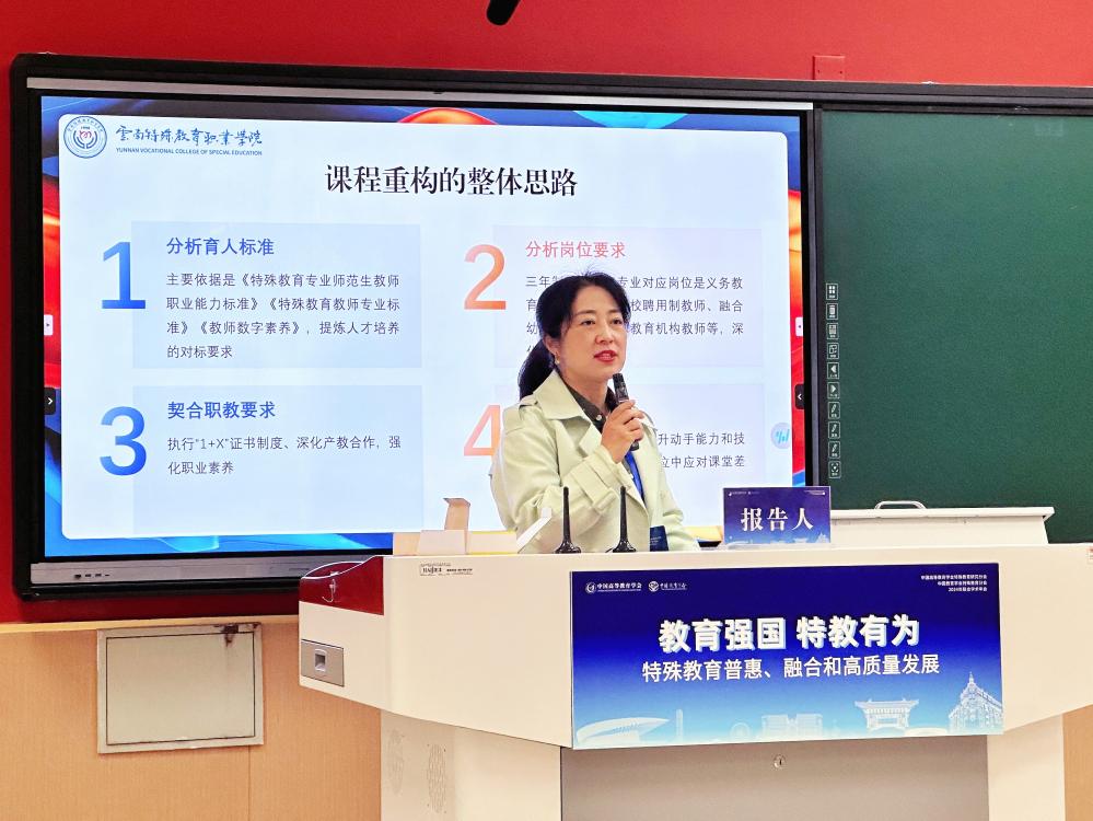 KY开元李永芳副校长在分论坛上以“数智技术赋能高职特殊教育‘金课’建设的思考”为题,指出随着数智技术的发展,广大残疾学生在接受高等职业教育的过程中,迫切需要高质量课程资源,他围绕“金课”建设的标准、应用和现实困境做了交流分享。