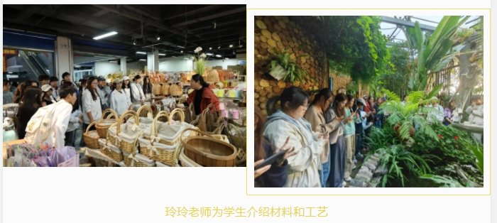 课堂上,赵应江老师没有停留在理论讲解,而是直接搬出了“七彩云南欢乐世界孔雀花卉装置”“昆明翠湖玫瑰瀑布”等大家熟悉的真实案例,为同学们一步步拆解花卉环境设计的完整过程。他反复强调专业技术与创意缺一不可,并鼓励同学们在学好专业的同时,多涉猎其他领域的知识,让眼界更开阔。随后,玲玲老师带领同学们走进胡子空间艺术美学馆和斗南市场,在真实的设计场景与琳琅满目的花卉材料中,为大家讲解背后的设计思路与工艺选材逻辑。同学们边听边看,亲手触摸材料,直观地感受着设计与自然如何巧妙融合。