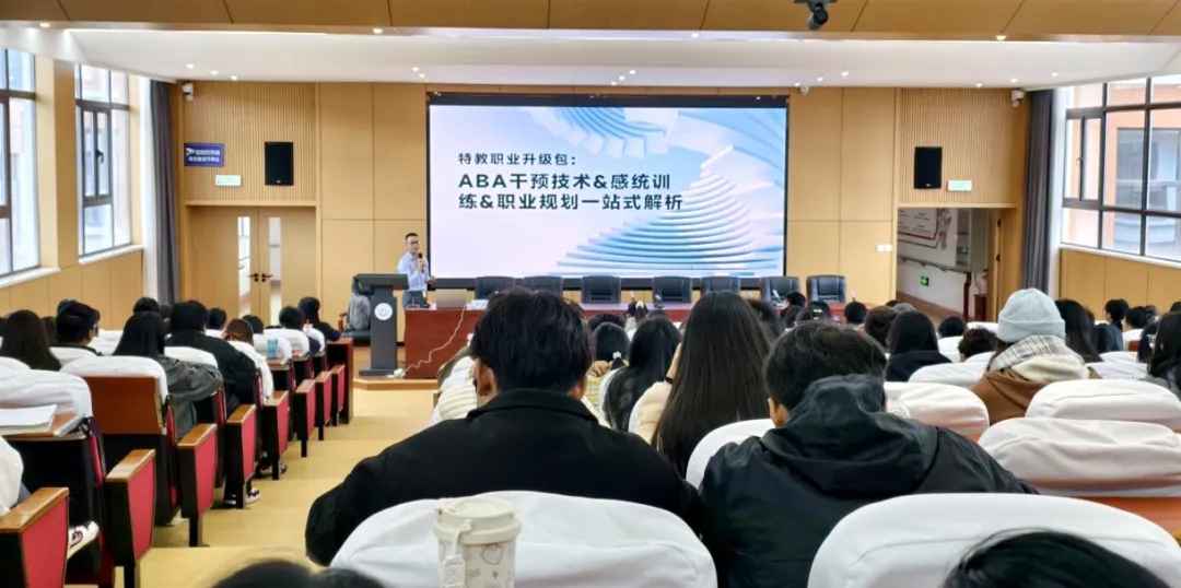 “特教职业升级包”指:ABA干预技术×感统训练×职业规划一站式解析”。讲座旨在提升学生们的专业技能,拓宽职业视野,为未来的特教职业生涯做好充分准备。莫艺德老师作为淳元教育的ABA教学总督导,不仅拥有深厚的学术背景,还在特殊教育领域积累了丰富的实践经验。讲座中,他通过生动的案例和翔实的数据,详细讲解了ABA技术在特殊儿童行为干预中的应用方法和实际效果,让学生们对这一技术有了更加直观和深刻的理解。随后,莫老师讲解了感统训练在特殊儿童身心发展中的重要作用,并分享了一系列实用的训练技巧和策略。他指出,感统训练与ABA技术相辅相成,能共同为特殊儿童的全面发展提供有力支持。