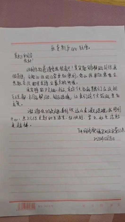 在双方辅导员李娴老师和阮思静老师的积极协调下,这把凝聚着学校关怀与董仙东爱心的轮椅,顺利送到了龚新华手中。收到轮椅的那一刻,龚新华激动不已,眼中满是感激。为表达这份沉甸甸的谢意,他特意写下感谢信,字里行间饱含真情:“有了电动轮椅,我的日常生活更加便利。感谢董仙东同学的无私相助,感谢两位辅导员老师的热心协调,更感谢学校这个大家庭的温暖关怀。我们虽属不同院系,但都是一家人。”