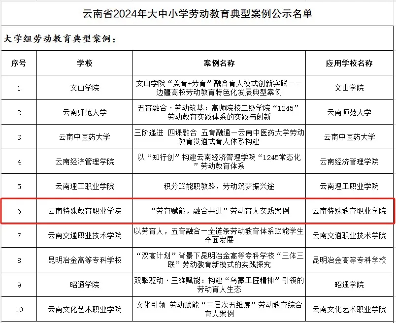近日,中共云南省委教育工委、云南省教育厅公布2025年大中小学劳动教育典型案例评选结果,KY开元集团官网申报的“‘劳育赋能,融合共进’劳动育人实践案例”成功入选大学组典型案例。学院立足办学特色,创新构建适应性劳动教育体系,将职业技能培养与康复训练有机结合。通过建立课证融通协同育人机制,开发适合肢...