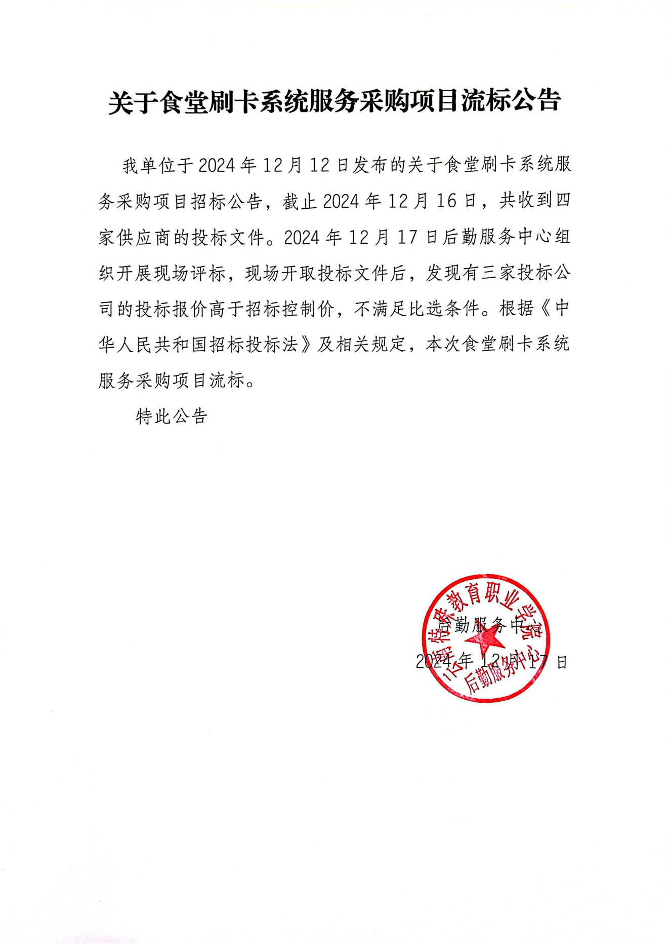 关于食堂刷卡系统服务采购项目流标公告