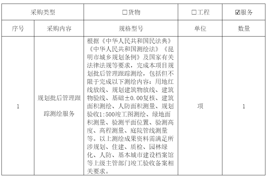 根据《中华人民共和国民法典》《中华人民共和国测绘法》《昆明市城乡规划条例》及国家有关法律法规等要求,完成本项目规划批后管理跟踪测绘,包括但不限于完成以下测绘内容:用地红线放线、规划建筑物放线、建筑物验线、基础±0.00复核、建筑面积测绘、人防面积测量、规划验收1:500竣工图测绘、绿地面积测量、验测平面位置、验测高度、高程测量、庭院管线测量等。以上测绘成果资料需满足所涉规划、住建、质检、园林绿化、人防、基本城市建设档案馆等上级主管部门竣工验收备案相关要求。