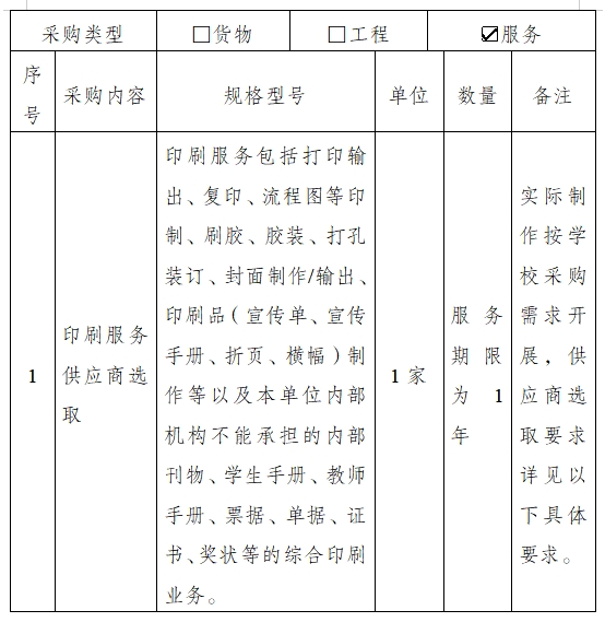 为保证学校的印刷需求,规范印刷采购流程,降低印刷成本、提高印刷质量,选取统一的印刷服务供应商,做好学校印刷服务。