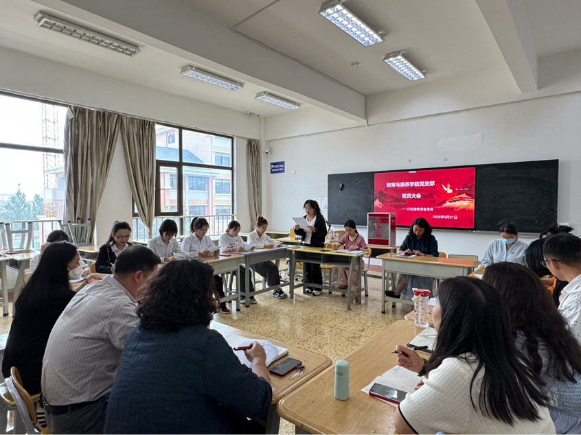 2025年5月21日下午,教育与康养学院党支部召开预备党员接收大会,会议应到正式党员13人,预备党员6人,实到正式党员12人,预备党员1人,其余5名预备党员线上参会。会议伊始,由支部书记邓迎带领全体参会人员进行第一议题学习。理论学习结束后,开展预备党员接收大会流程,首先由刘苏霈、王瑶、李井亲、王体艳...