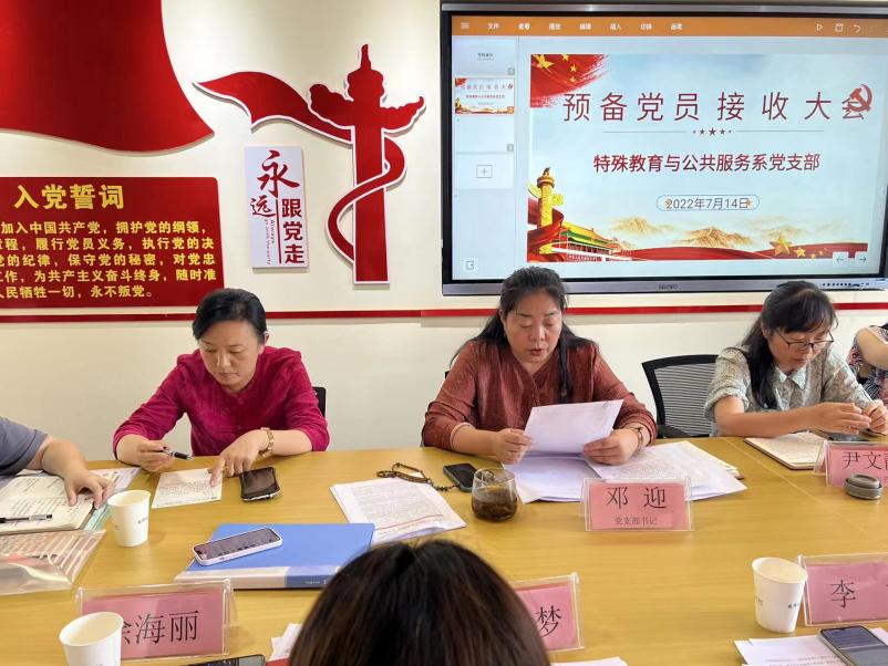 根据支部发展党员工作计划,经上级党委预审同意,特殊教育与公共服务系党支部于2022年7月14日在玉璋楼206召开支部党员大会讨论讨论接收2022年预备党员,会议由支部书记主持。