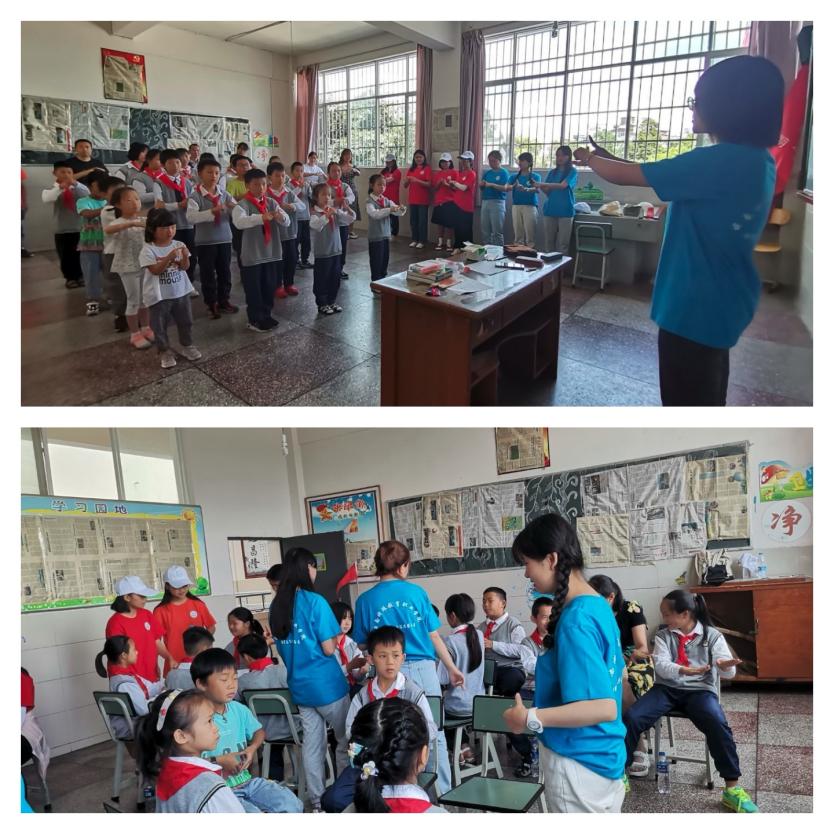 7月10日下午,团队分为两个小组,分别开展手语教学和敬老爱老活动。特殊教育专业的同学深入禄充小学,带领孩子们学习手语版国歌,以别样的方式带动小学生的爱国热情,给孩子们讲红色故事、通过手语教学、玩游戏等多种方式,了解禄充小学的基本情况、国家政策的落实状况等。手语教学成效显著,不少小朋友短短时间就掌握了许多手语词汇。整体活动氛围欢乐而热烈。