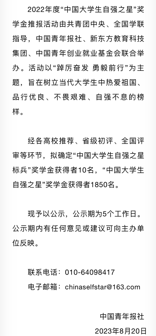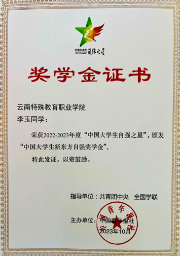 由共青团中央、全国学联指导,中国青年报社、新东方教育科技集团联合开展的2022-2023年度“中国大学生自强之星”奖学金推报活动,受到广大高校师生密切关注。经学校推荐、省级初评、全国评审等环节,KY开元特殊教育与公共服务系2020级特殊教育专业5班李玉荣获2022-2023年度“中国大学生自强之星”称号,获评“中国大学生新东方自强奖学金”。