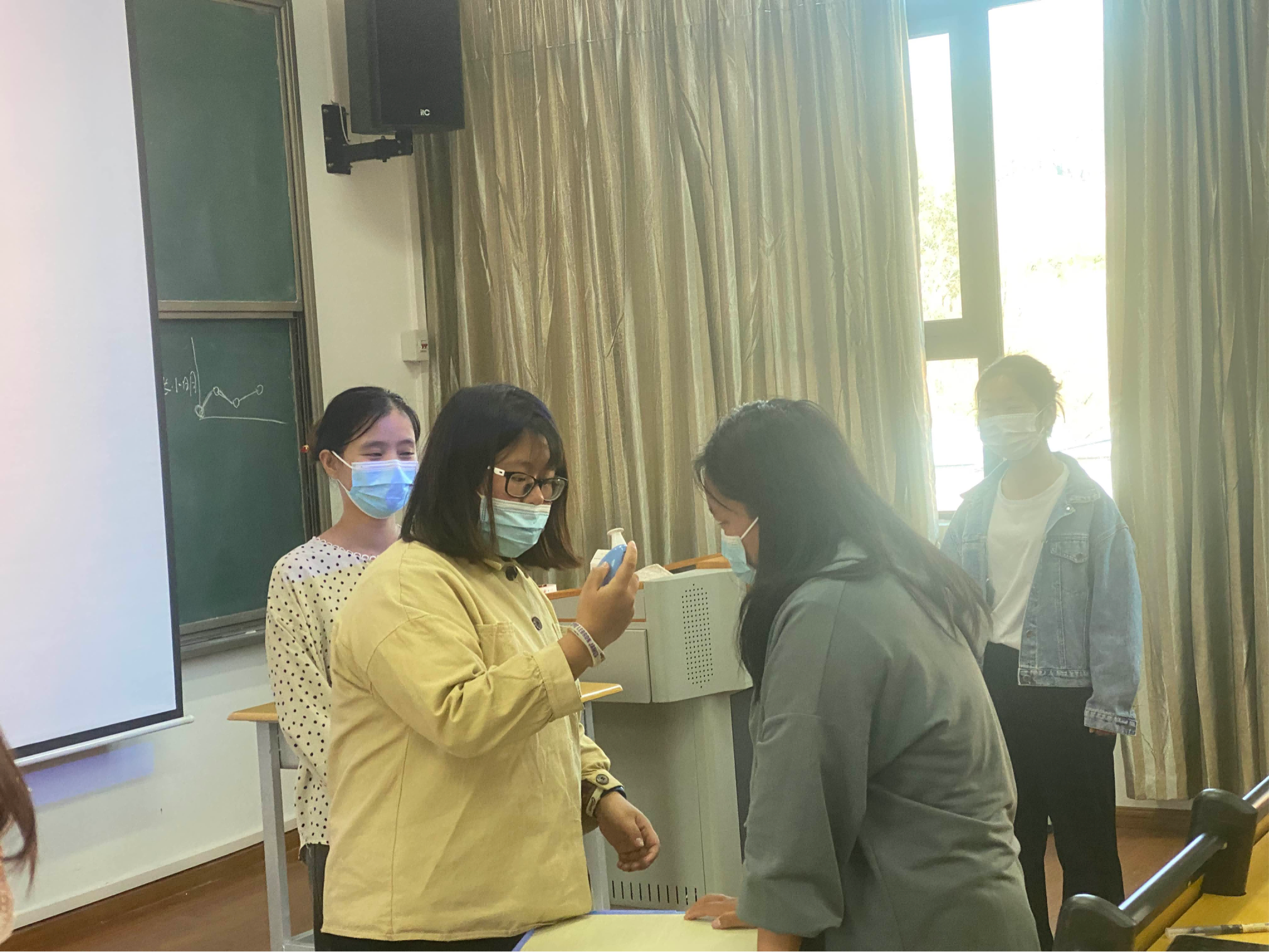 第二个场景中,任课教师上课过程中发现一名学生体温异常,并有疑似症状,任课教师告知班上学生佩戴口罩,马上打电话联系校医室,同时本人或安排班委通知班辅导员,辅导员接到电话之后,立即按照预案的应急处置流程进行上报和处置。医务人员到教室将发热学生带到楼道测量体温,再次测温结果高于37.3°C,则将发热学生带到校医室观察。教室停课,疏散学生,消毒人员对教室进行消杀。辅导员做好后续跟进工作。