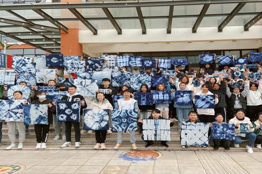 活动开始,云南民族大学艺术学院刘晓蓉老师的团队成员为师生们介绍了非物质文化遗产、传统文化传承基地和扎染工艺的基本知识和制作技巧等,通过生动细致的讲解,让师生们深刻体验到中华优秀传统文化的博大精深。接着,工作人员给每个人分发了扎染制作工具和布料,师生们根据自己的喜好将布料用皮筋扎起来,并将扎好的布料放进盆里浸染,大概半小时之后,一件件精美的扎染作品呈现在大家眼前,由于手法不同,每一件扎染作品都是独一无二的,大家脸上都洋溢着自信灿烂的笑容。活动结束后,全体人员进行了合影留念,现场气氛热烈。