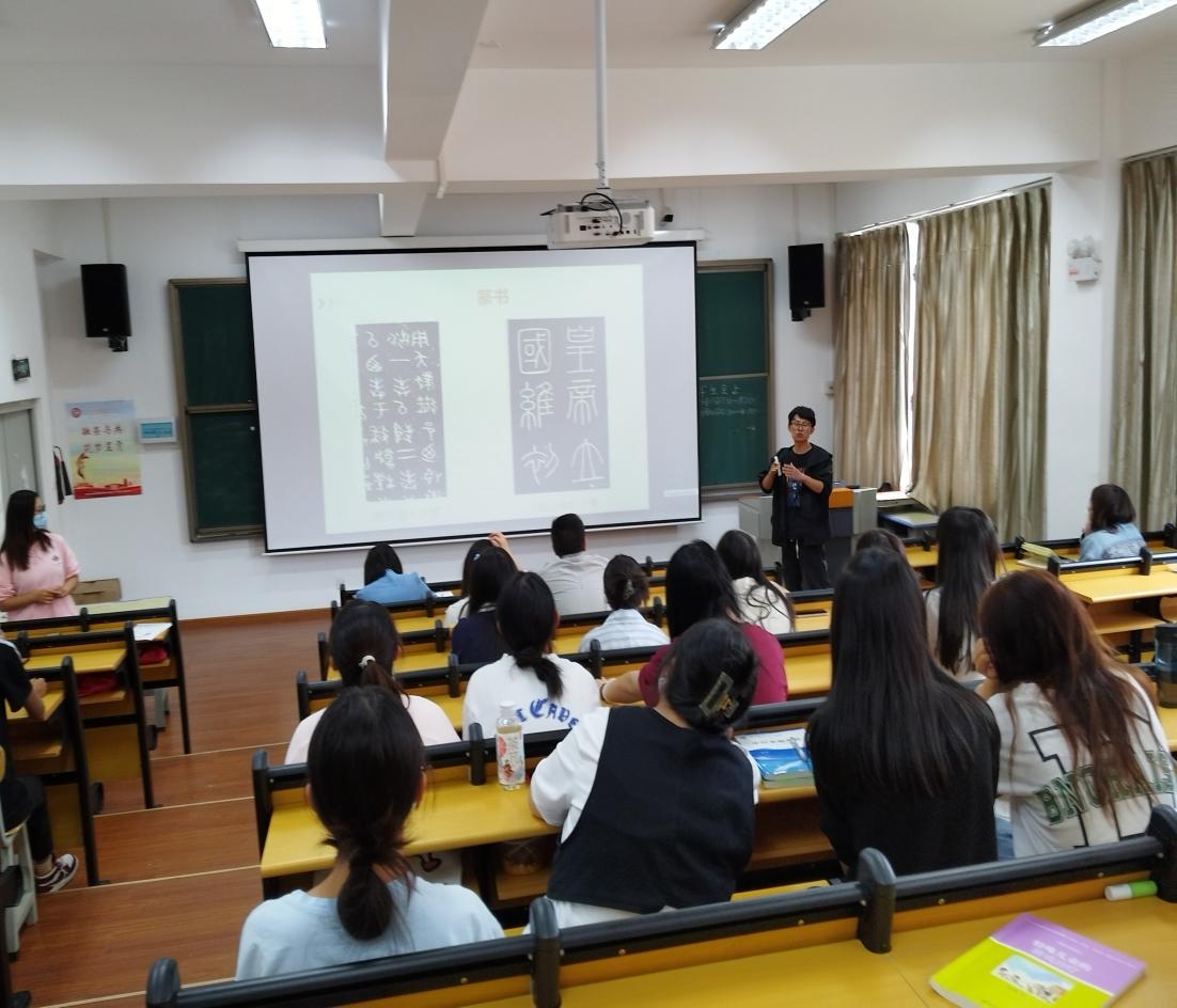 活动中,刘铎老师从汉字的起源出发,讲述了书体衍变、经典书法作品赏析、书法文化在当下的意义等,汉字是世界上起源最早的文字之一,数千年来,中华民族在传承文明的过程中,创造了篆、隶、楷、行、章草、今草等形式多样的书体,书法始终与中国哲学、传统文化精神保持着紧密联系,最后,刘铎老师结合日常生活,强调了练习书法可以涵养品格、提升审美、润化心灵。