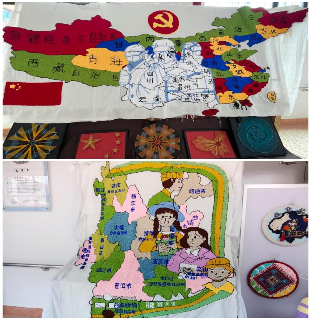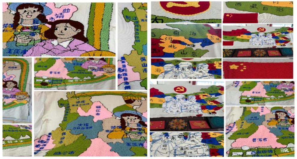 另一幅是以云南地图为载体,以脱贫攻坚为核心。脱贫攻坚的列车跑遍了全中国,跑遍了大云南,全国人民都在为实现全面小康社会而奋斗。终于在党的带领下,我国打赢了这场脱贫攻坚战,身处新时期,我们既面临着新挑战,也有了新的机遇和舞台,应以饱满的热情、积极的态度和务实的精神自觉主动地投身到学习与工作中,走进人群中,为祖国的繁荣昌盛奉献一己之力!