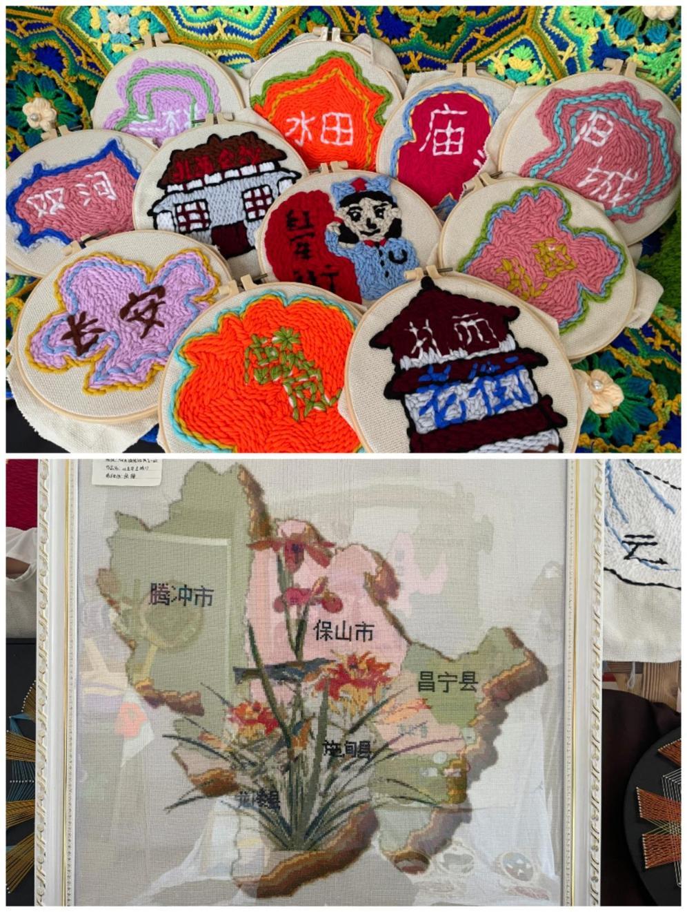 作品以中国地图和云南地图为背景,结合疫情防控、脱贫攻坚展开,以戳戳绣的表现手法来设计,体现在党的领导下全国人民坚定信心、同舟共济、科学防治、精准施策,共同打赢疫情防控阻击战和脱贫攻坚战。